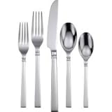Clean and detailed with a subtle double band at the neck, this stainless steel flatware pleases the eye with symmetry and balance. Dishwasher safe. 45-piece set includes eight each of the dinner fork, dinner knife, dinner spoon, salad fork and teaspoon, plus one serving spoon, one pierced serving spoon, one serving fork, one butter knife and one sugar spoon. Read more