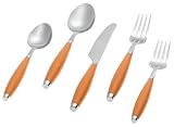 Exclusvie Fiesta 5 piece flatware to match or coordinate with Fiesta dinnerwareA new Fiesta style for 2007, this flatware comes in a dozen color choices, each perfectly matched to a Fiesta dinnerware hue. Unlike the previous Fiesta flatware with its flattened, rounded tab handles, the new version displays shiny plastic handles in a tapered spindle shape. The fork tines, spoon bowls, and knife blades, as well as a cap at the very tip of each handle, are all made of brightly polished stainless steel. A pleasure to hold as well as look at, the cheerful flatware complements any dinnerware, and goes happily on picnics and camping trips.