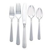 A trio of rings adds a sculptural element to the forks and spoons in this classically designed pattern. On the knife, a single sphere is sculpted below the blade for beautiful display upon your table. Simply styled, Pearl Platinum can be used for both formal and casual dining occasions. Crafted of stainless steel, the service is easy to clean, making it ideal for everyday use.With accents of precious platinum, this five-piece flatware set from Lenox brings a touch of elegance to the table. The Pearl Platinum place setting provides service for one, including a 9-inch dinner knife, an 8-1/4-inch dinner fork, a 7-inch salad fork, a 7-inch soup spoon, and a 6-1/4-inch teaspoon. The handles feature little adornment, gently rounding at the tips. Three radiant halos encircle the necks of the forks and spoons, while a solitary molded globe separates the knife blade from its handle. Lenox crafted the flatware in 18/10 stainless steel to resist tarnish, rust, and warping for years of use. Dishwasher- safe, clean the flatware with a mild detergent for the best results. Users should avoid soaking the utensils in order to thwart pitting, drying hand-washed pieces immediately. All utensils benefit from a lifetime breakage replacement program upon registry. Lenox offers an assortment of Pearl Platinum tableware and serving utensils to complement the flatware. --Jessica Reuling