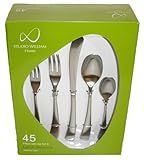 The Studio William Collection by Cambridge Silversmith flatware features high quality durable stainless steel, perfectly balanced and weighted, that never needs polishing. Each piece is expertly hand-crafted with attention to beautiful detail and finish. All stainless steel flatware is dishwasher safe, easy to maintain, and carries a full 25-year warranty. Cambridge Silversmith combines materials of the highest quality to ensure each piece of flatware maintains its brightness and finish. 45-piece set is service for eight and includes 8 dinner forks, 8 salad/desert forks, 8 dinner spoons, 8 teaspoons and 8 dinner knives, 1 serving spoon, 1 slotted spoon, 1 cold meat fork, 1 butter blade and 1 sauce spoon. Read more