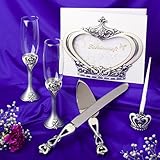 A Royal Wedding is yours with our Royal Wedding Collection of crown design wedding day accessories Your wedding day is surely a day when you want to feel like royalty. And, with Fashioncraft's exclusive Royal Wedding Collection set of crown design wedding day accessories you can seamlessly add lasting touches to your own royal wedding. Complete with all the trimmings you'll need for your reception, the set includes two 9" x 2" toasting flutes , a 12" x 1" cake knife and 10" x 2" server set, a 9 ¾" x 7 ¾" guest book , and a 7 ¾" x 1 ¾" pen set. Sure to be a memory-filled keepsake set that you will treasure forever and one that can be passed on as a regal new family tradition, each piece is exquisitely crafted with pewter-colored poly resin in a detailed/carved crown design and comes packaged in an olive and cream damask design display box with a clear top - great for safe storage after your big day is through.(Set includes #2431 flute set,#2432 cake knife set, #2433 guest book and #2434 pen set) Read more